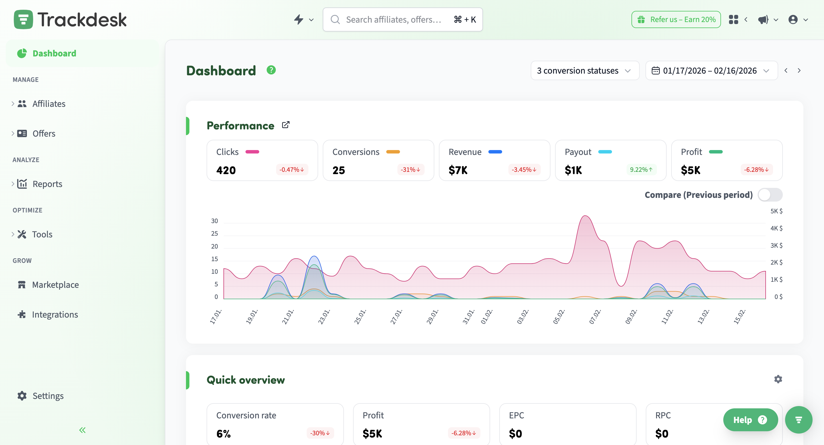 This helps you spot gaps you can exploit or match to stay competitive. Check out the Trackdesk affiliate program for an example.