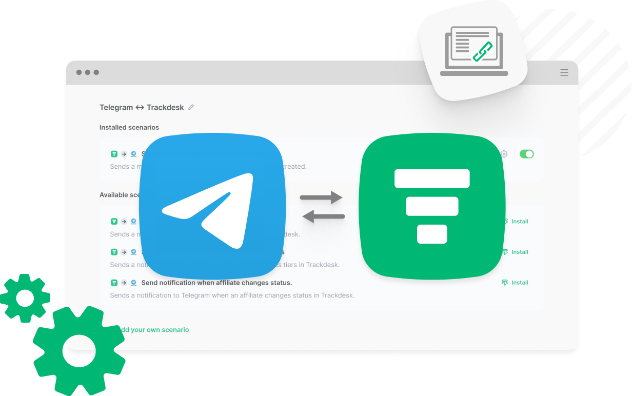It sends automated messages to Telegram chats or channels when affiliate events occur in Trackdesk.